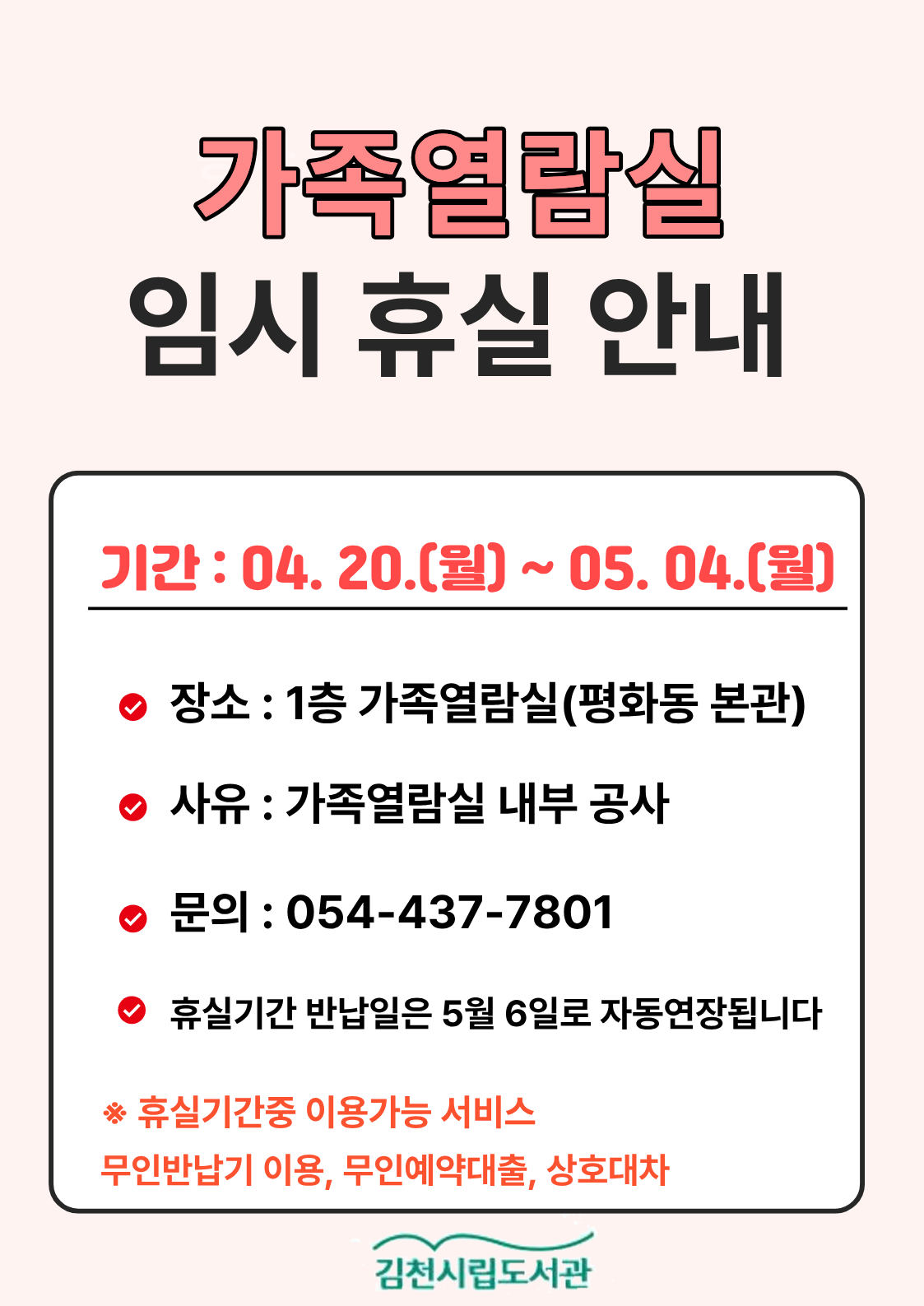 김천시립도서관(본관) 가족열람실 임시휴실 안내...