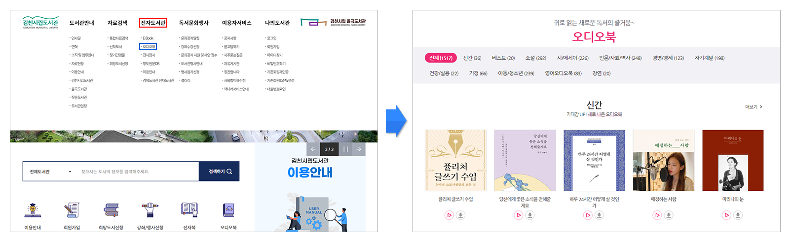 김천시립도서관 오디오북 이용방법을 PC와 모바일 버전에 따라 안내해드립니다.